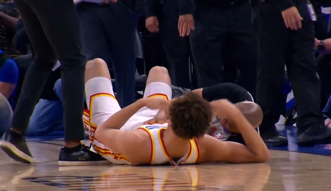 比塔泽身后拉拽兰代尔致其膝盖着地 2级恶意驱逐!丹尼尔斯吃T! 【发布时间】:2026-04-03 08:30 【来源】:24直播网 NBA常规赛,老鹰VS魔术。比赛末节,比塔泽在防守中从身后一把拉下空中的兰代尔,致其膝盖着。随后老鹰众将不满,双方爆发激烈冲突。裁判在冲突中紧紧抱着情绪激动的老鹰后卫丹尼尔斯,随后两人双双倒地。最终,比塔泽二级恶意犯规离场,丹尼尔斯技术犯规,兰代尔退赛。裁判为保护丹尼尔斯 两人双双倒地